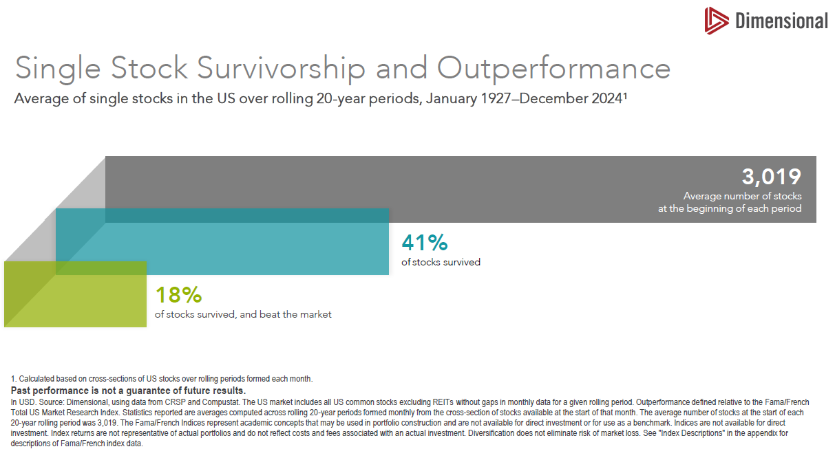 When looking at 20-year rolling periods: Only 18% of all stocks both survived and outperformed the market. In other words, if history is any guide, the odds of picking a stock today that both endures and beats the market over the next 20 years are relatively low.