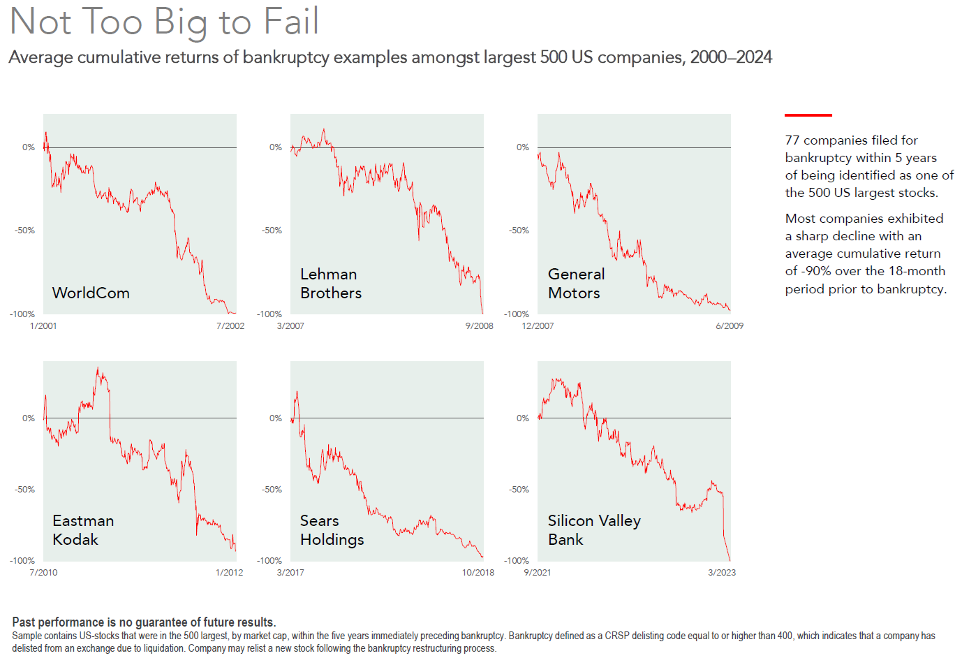 General Electric (GE) was a top-five company in the S&P 500 for nearly three decades before its dramatic fall, losing 44.8% in 2017 and another 56.6% in 2018. Once-giant names like BlackBerry, Lehman Brothers, Sears, WorldCom, General Motors and Wachovia were also considered “too big to fail” — until they did.